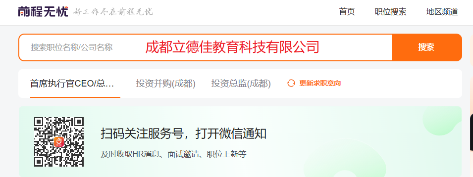 登录后,在搜索栏输入“成都立德佳教育科技有限公司”,查看招聘岗位